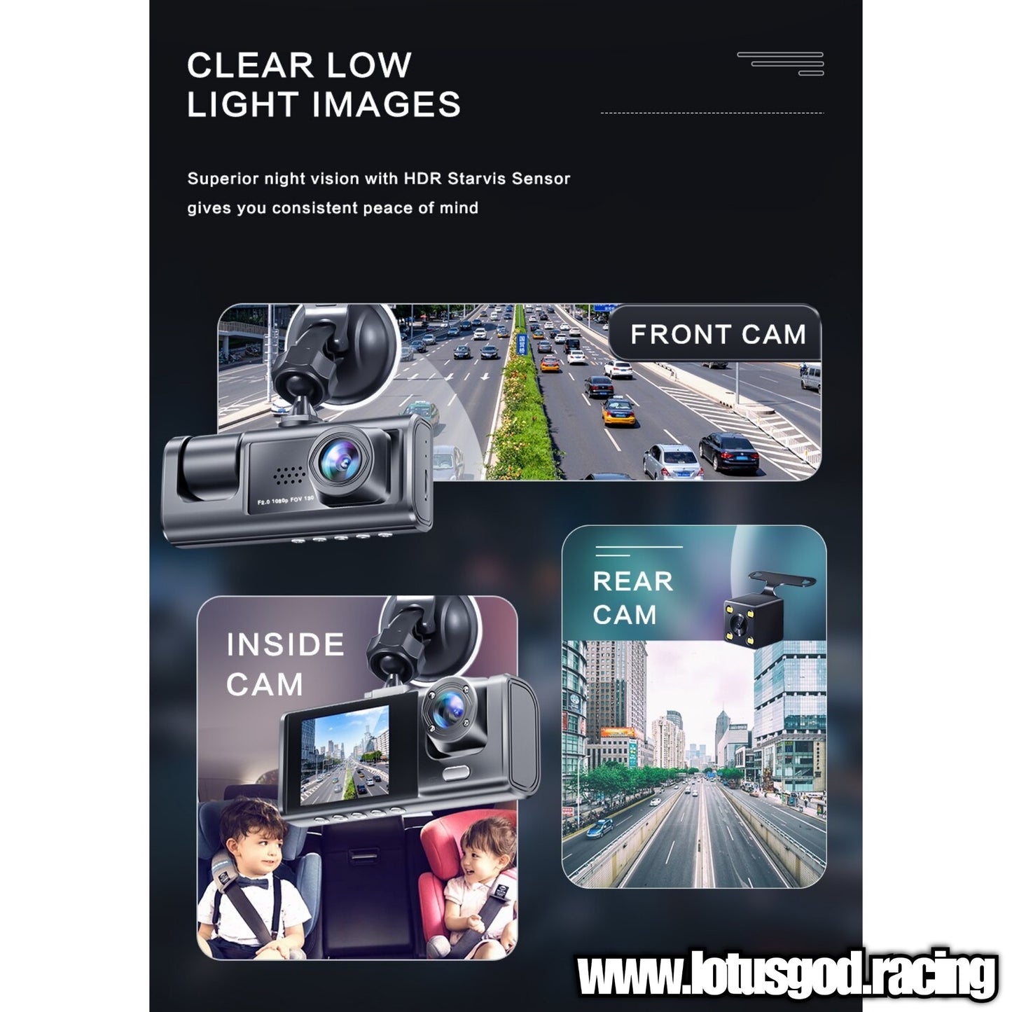 1. Dual Camera Shooting: This dash cam is equipped with dual cameras. One records the front of your car and the other records the interior of your car. 3rd camera records the rear view or place anywhere you like