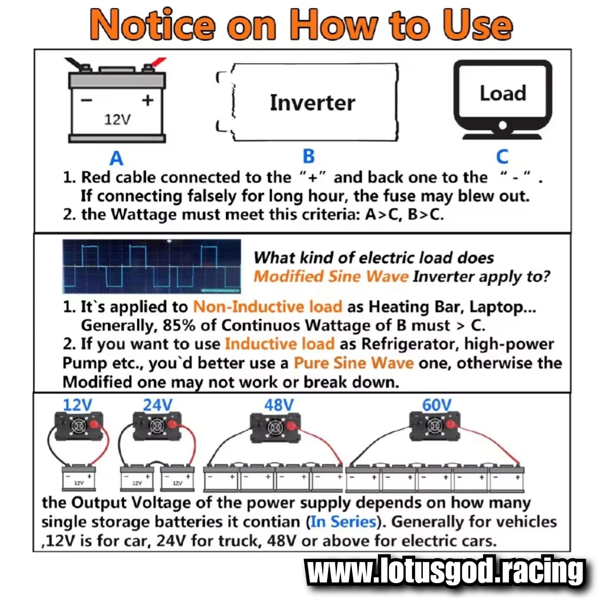 6. Please do not overload. If your applications are inductive loads, please choose the inverters whose continuous power is 3-7 times higher than the watts of your appliances. such as fridge, icebox, drill, washing machine, water pump, microwave oven, oven, vacuum cleaner, hair dryer, etc. with motor inside. Please make sure the constant power of our inverter meets your need. No guarantee it will work as some device are too high wattage